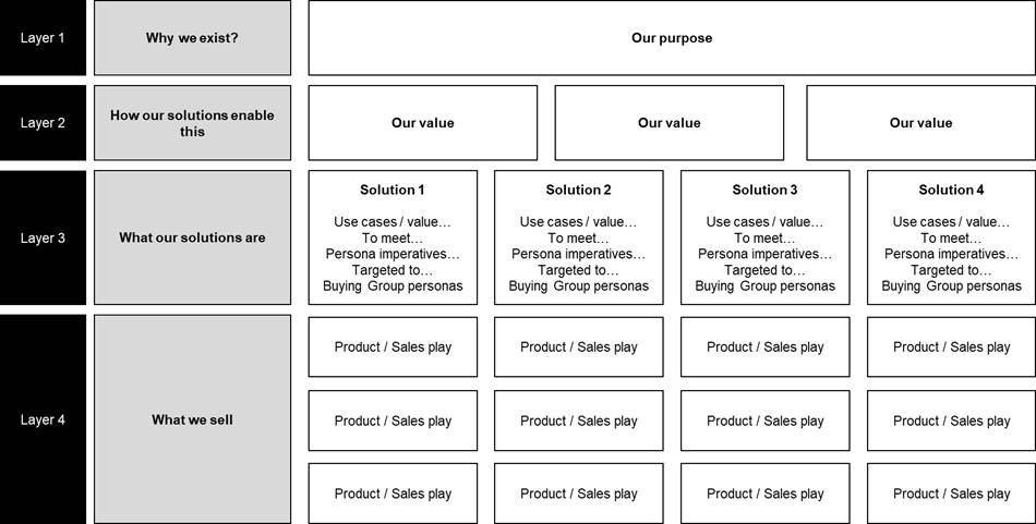 Layer 3: The solutions you offer customers. Solutions communicate use case and value that meets the needs and business imperative of the buying group to which the solution is targeted.
