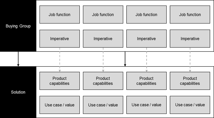 Enterprise buyers typically operate as buying groups – even if the group is not fully defined, understood or communicated, multiple influences will be considered before a decision is made. In the context of products and solutions a Buying Group is comprised of a collection of different Job Functions. Each Job Function has business Imperatives – things they must do in the form of challenges they must solve, risks they must mitigate or opportunities they must seize. You have a Solution, which is a set of Product Capabilities that map to the Buying Group’s Imperatives. And each of those Product Capabilities will have Use cases and Value that you can use to inform the differentiated positioning and can act as proof points. Your go-to-market approach will be to communicate these Use Cases and Value aligned to your prospect’s Imperatives and target those communications at the collective Job functions in the Buying Centre. These different elements can be considered visualised like the below: