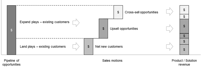 Even if your product or service portfolio is diverse and interconnected, it is likely that some solutions will still be more applicable to new customers as a first purchase and some solutions will be more relevant to existing customers. Identifying the gateway products that are the first point of purchase for new customers will allow you to prioritise messaging and activity appropriately. These gateway solutions form the basis of your net new customer land motions, while the remainder your solutions may draw in relatively few net new customers and form the focus of your cross- and upsell expansion motions to increase share of wallet. Understanding and prioritising sales motions is an important way of driving efficiency both for Sales and Marketing. Deploying resources and budget on new business opportunities with a solution that is most commonly sold as an upsell to an existing buying group is unlikely to drive an efficient return on investment. Solution mix might evolve with time so is important to constantly re-evaluate.